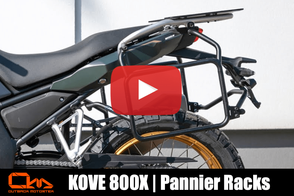 Our pannier racks are constructed of mild steel, which is what makes them robust enough to hold your luggage and absorb impact from drops and tip overs if things go south! Additionally, they have standardised dimensions [350mm (L) x 250 (H) made of 18mm diameter tubing] which gives you the option of mounting a wide range of panniers. The pannier racks for the Kove 800X are available with an asymmetrical design with (TBA)cm in width once installed!