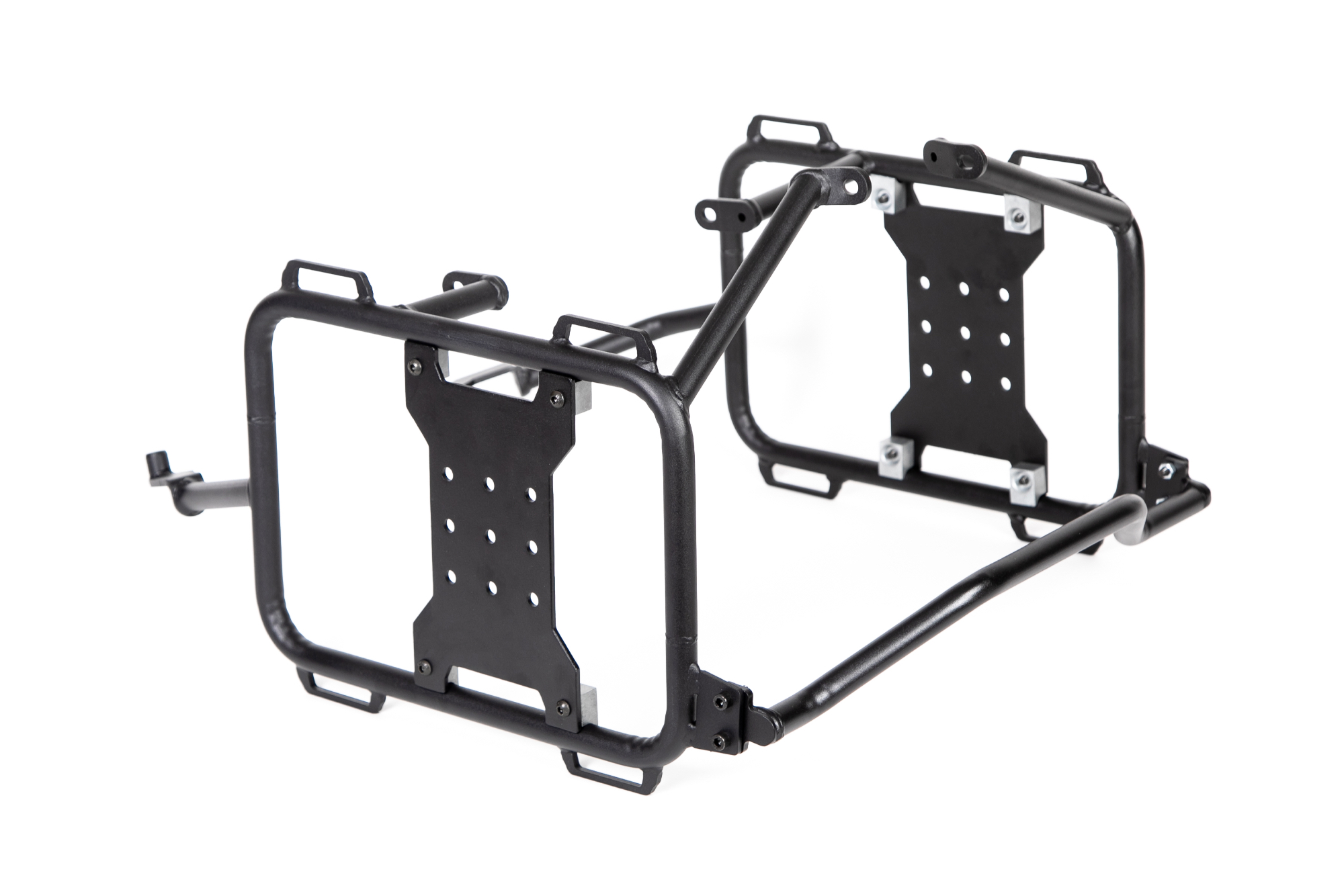 Designed and manufactured by Outback Motortek. The new X-Frames are the most universal and functional side pannier frames yet, allowing simple, secure mounting of Rotopax, hard panniers and soft luggage.